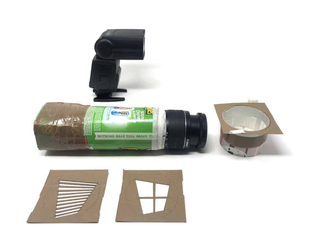 To make a Gobo projector: split a Pringles tube, tape a kit lens into the gap, cut out a Gobo pattern in card, fix it to the outer end of the tube, squeeze a Speedlite into the other end, zoom and focus the lens til the gobo pattern is sharp, set the flash and camera settings, take a test shot.